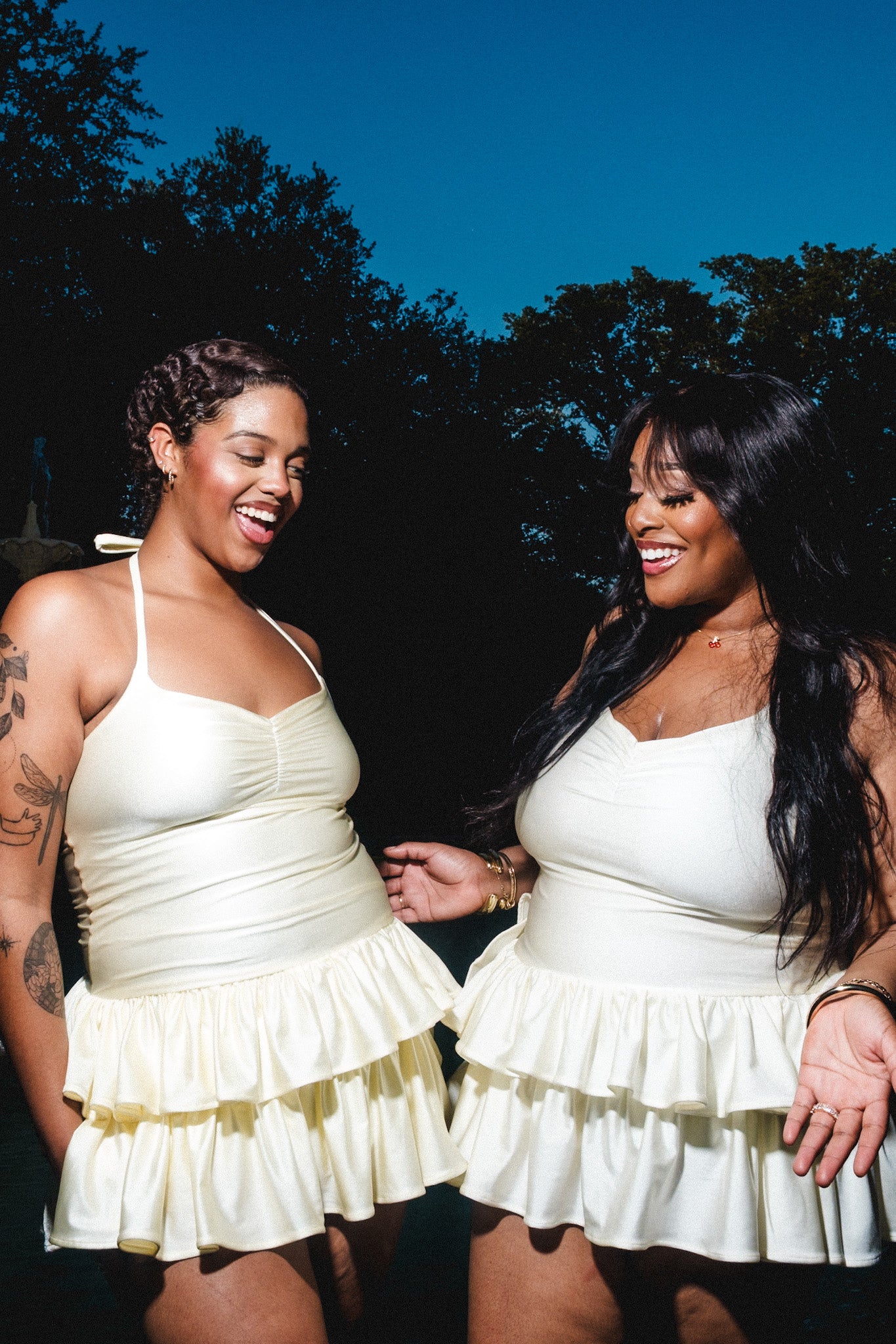 Thoughtful details. Includes built-in bloomer shorts for worry-free movement and a smooth, tailored look.